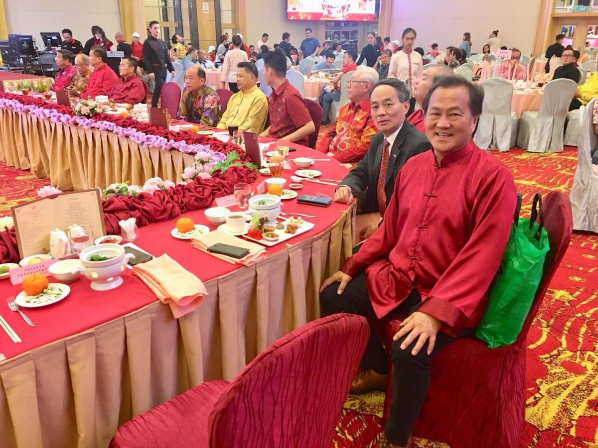 美里省华人社团联合会会务顾问拿督许庆璋(左)与中国驻古晋领事程洪合摄于“2019己亥年新春大团拜”。